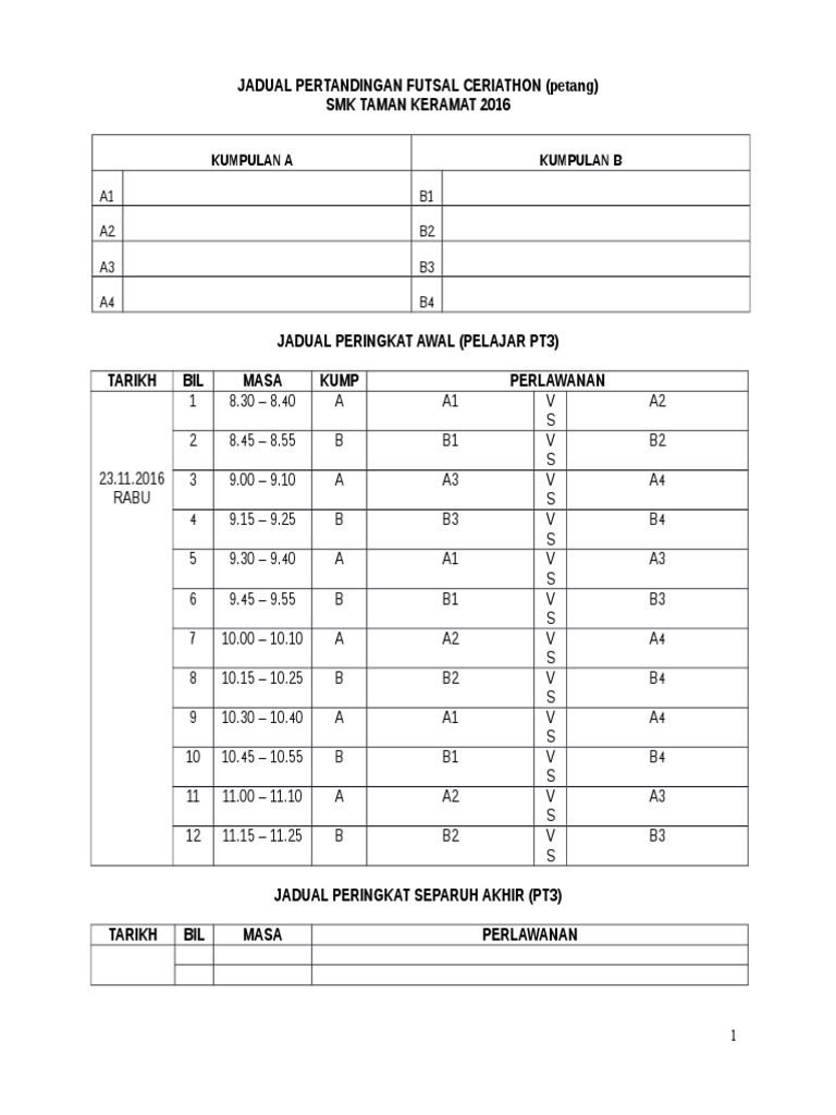 Contoh Jadual Pertandingan Futsal