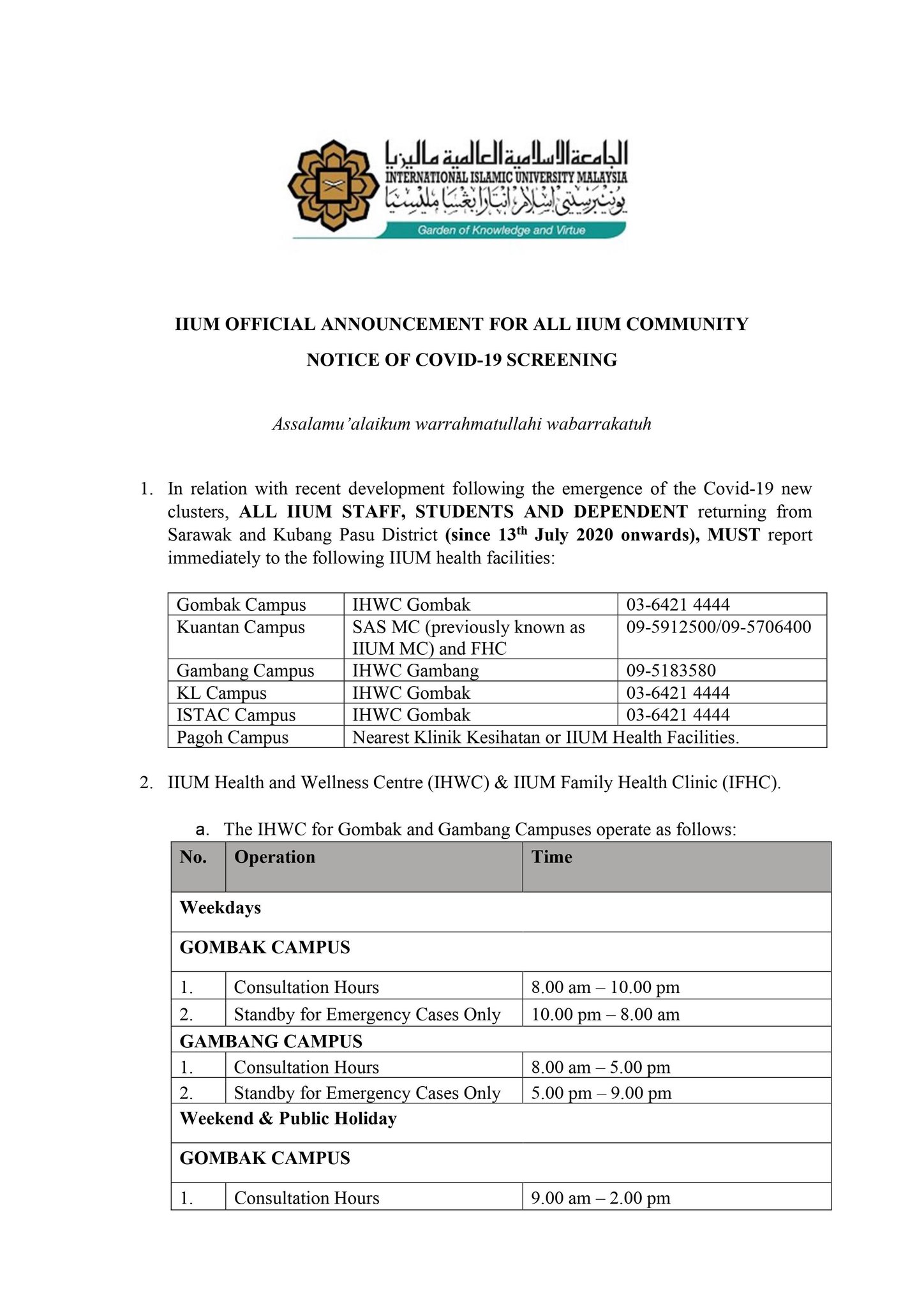 Officialiium On Twitter Notice Of Covid 19 Screening All Iium Staff Students Dependent Returning From Sarawak Kubang Pasu District Since 13th July 2020 Onwards Must Report Immediately To The Following Iium