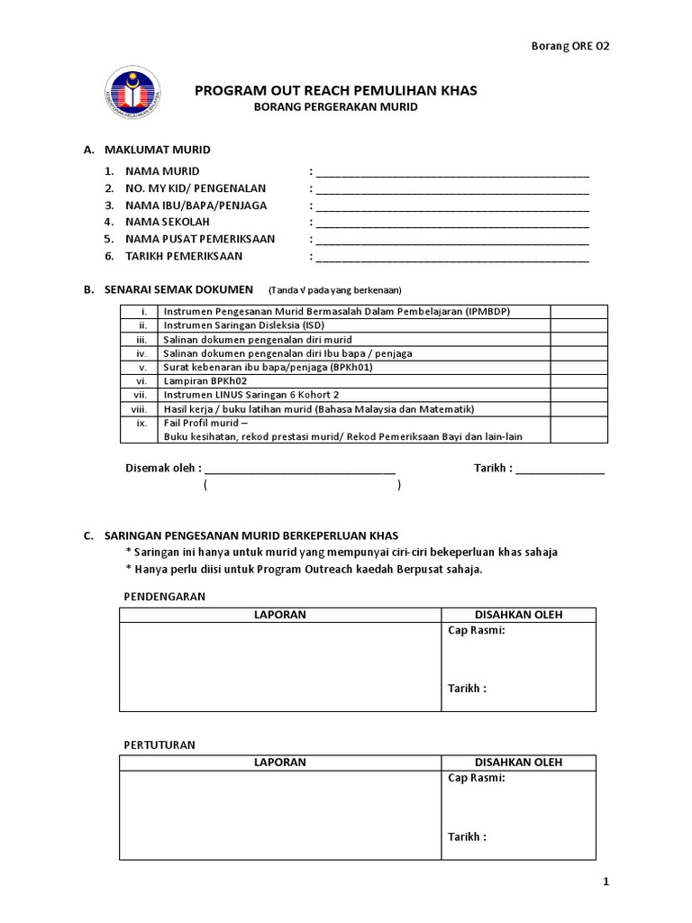 Program Pemulihan Khas Outreach Borang Pergerakan Murid Tandakan Pada Yang Berkenaan