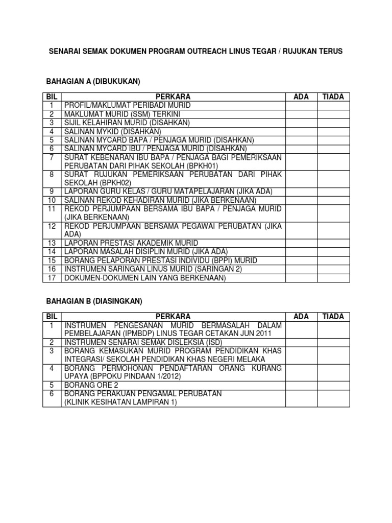 Senarai Semak Dokumen Program Outreach Linus Tegar Rujukan Terus