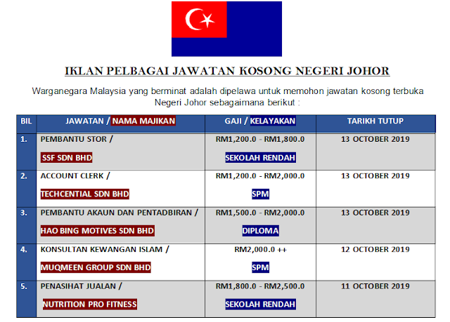 Jawatan Kosong 2019 Negeri Johor Kelayakan Pmr Spm Diploma Ijazah Ejawatankini Com