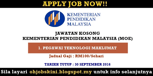 Jawatan Kosong Di Kementerian Pendidikan Malaysia Moe 30 September 2016 Appjawatan Malaysia