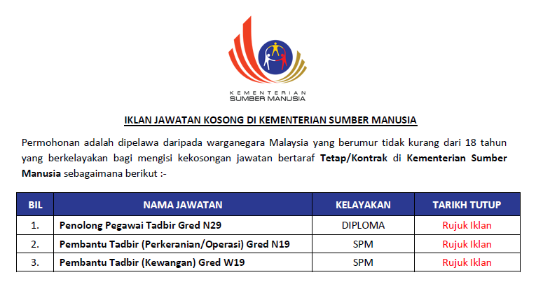 Jawatan Kosong Di Kementerian Sumber Manusia Kelayakan Spm Diploma Ejawatankini Com