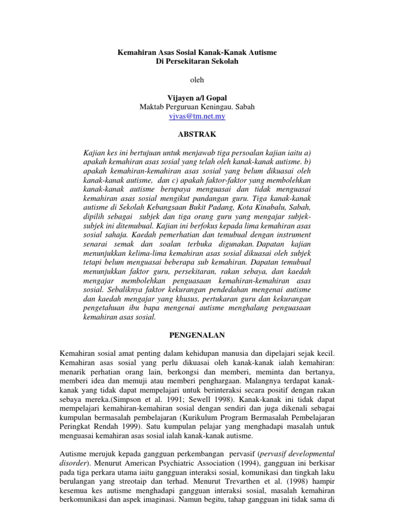 Pdf Tahap Kemahiran Sosial Murid Murid Autisme Bagi Program Pendidikan Khas Integrasi Bermasalah Pembelajaran Saiful Azam