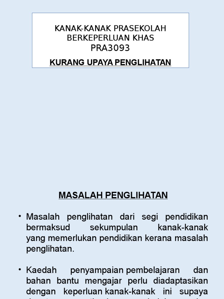 Kanak kanak berkeperluan khas masalah penglihatan. Definisi masalah penglihatan dari segi pendidikan sekumpulan kanak kanak yang memerlukan pendidikan khas kerana masalah penglihatan. Kaedah penyampaian pembelajaran dan bahan bantu mengajar perlu diadaptasikan dengan keperluan kanak kanak ini supaya dapat mengoptimakan pembelajaran dan pencapaian mereka. Disamping itu juga kanak kanak bermasalah penglihatan ini mengalami masalah tingkah laku yang berbeza dengan kanak kanak normal.