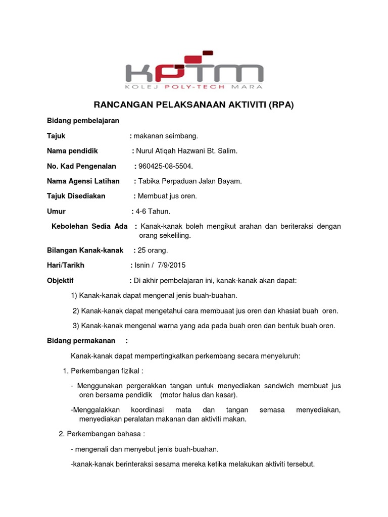 Doc Rancangan Perlaksanaan Aktiviti Rpa Effa Hasfarina Academia Edu