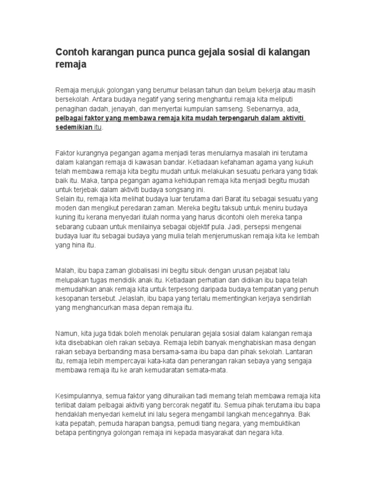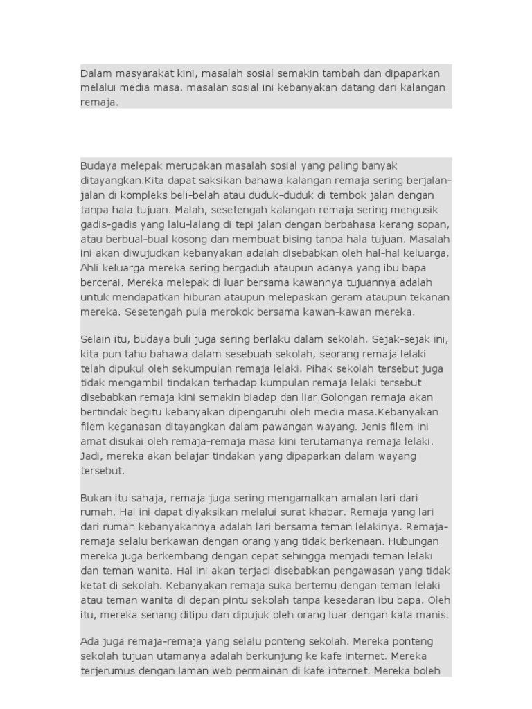 Karangan Punca Punca Gejala Sosial Dalam Kalangan Remaja Spm